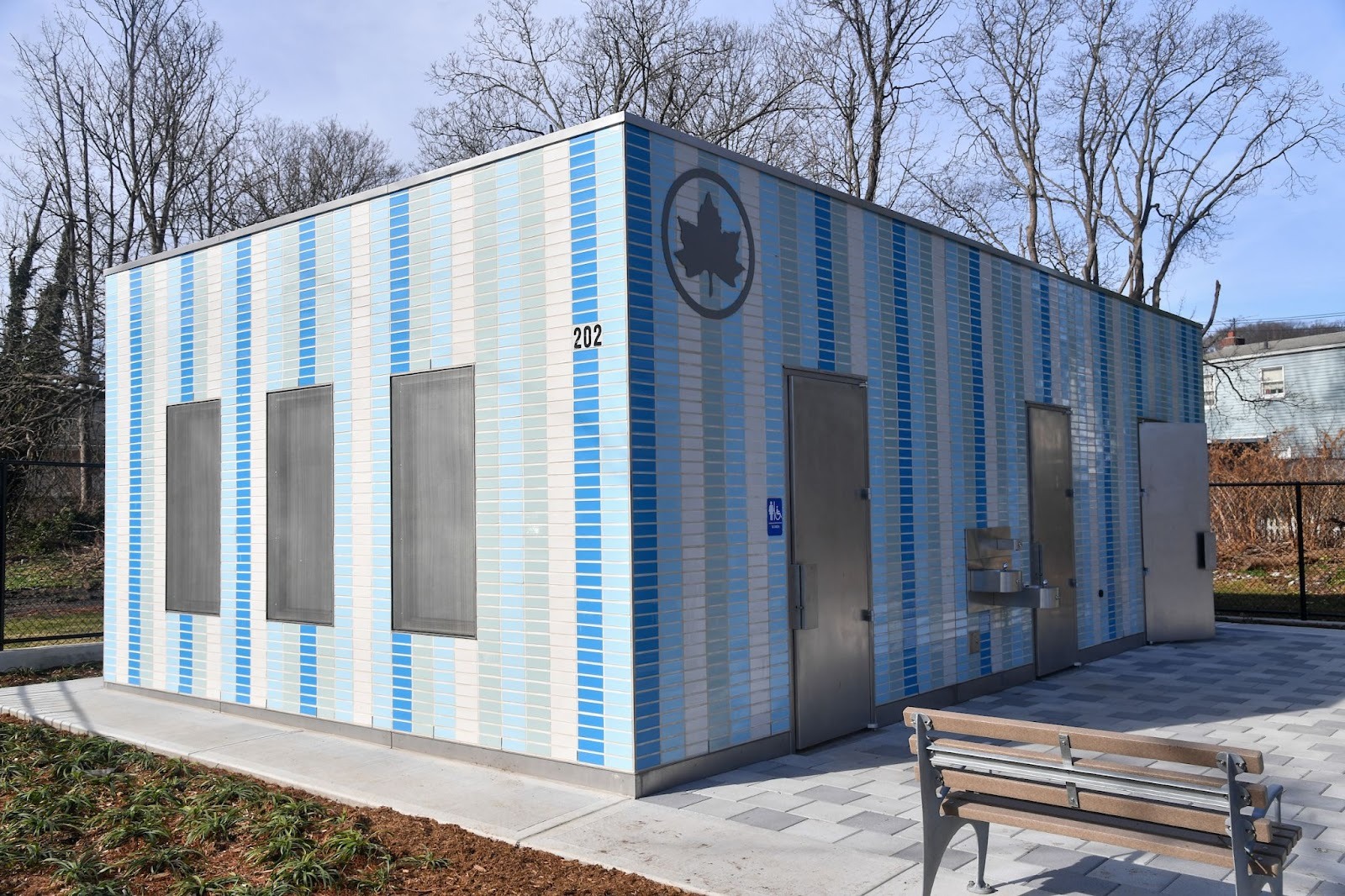 Standing at one end of the playground, its facade of blue-and-white brick is surprisingly cheery, especially compared to the austerity of JCDecaux’s automated toilets and the Portland Loo. Its design goals are similar to those models — low maintenance and “vandal-proof” restrooms with an expedited construction model (and possible cost savings) — but the execution feels different. With white tile walls, the inside feels brighter than the dull metal of the stainless steel capsules, and while small stall walls mean privacy is sparse inside the two gendered rooms of the restroom, having a full wall between where you do your business and the sounds of the playground balances with most expectations of a public restroom.
